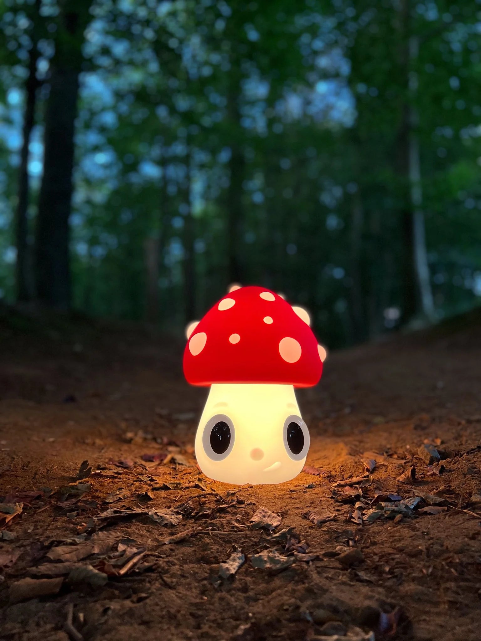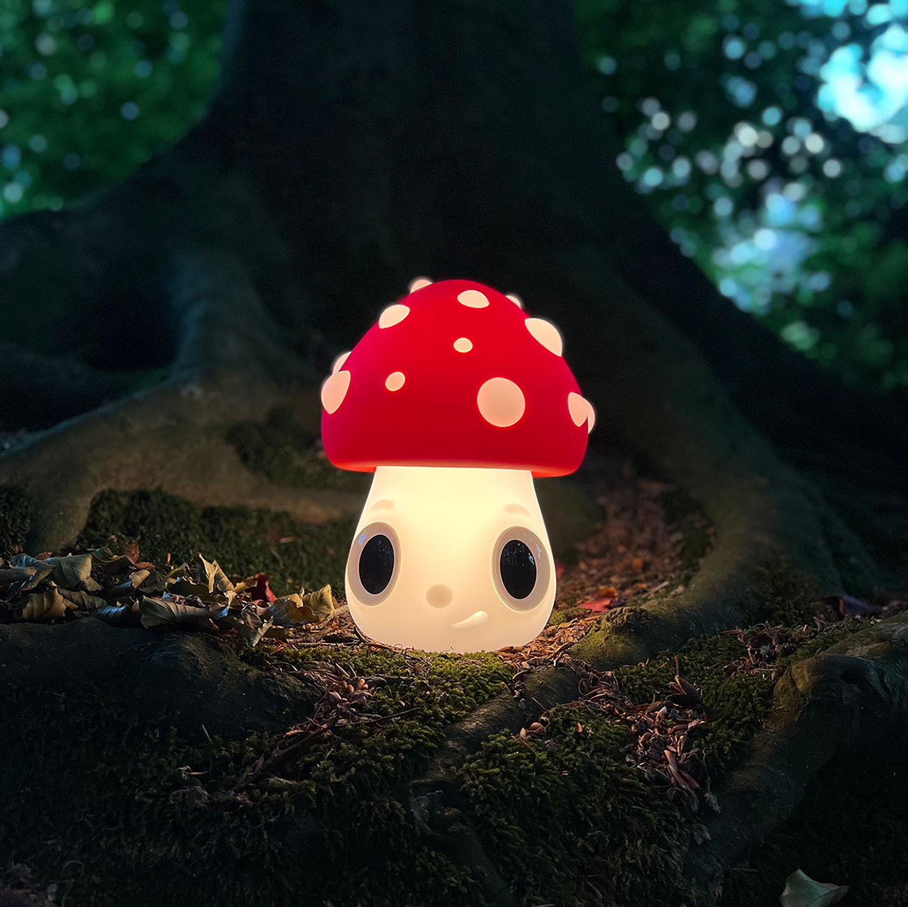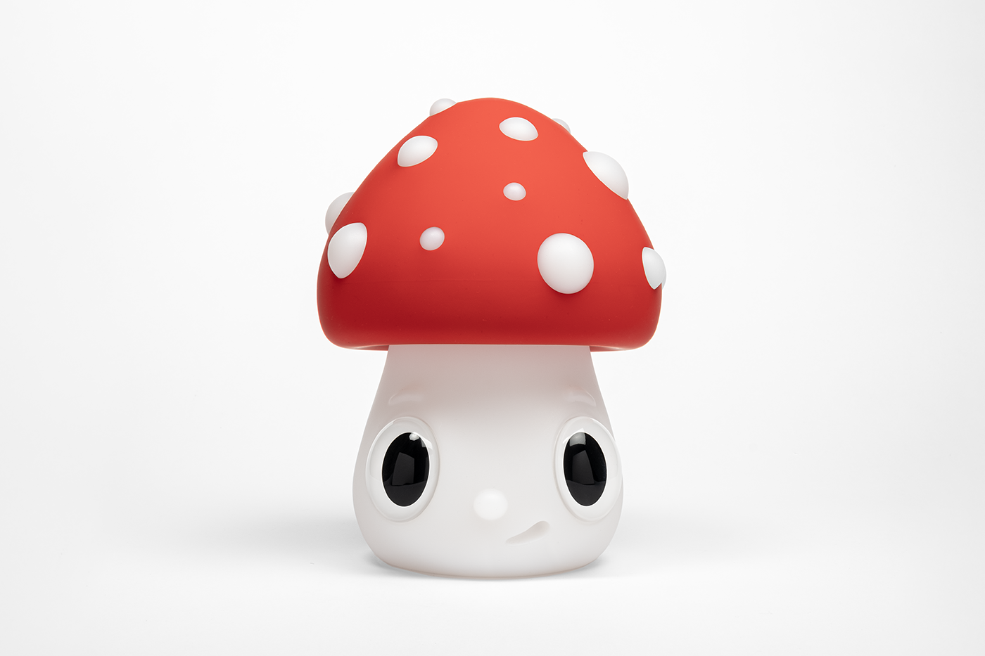 The Nightlight Mushroom stands out with its large red cap adorned with white spots, reminiscent of the iconic Amanita muscaria mushroom. This choice of color and form is intentional: Calleja plays with the association of this type of mushroom with imaginary worlds, psychedelia, and surrealism, incorporating his own vision into an everyday object. The character’s head seamlessly blends with the cap, giving it a hair-like appearance that reinforces its identity within Calleja’s artistic universe.
